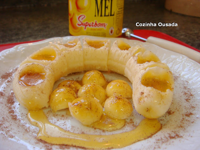 Eu descasco a banana, faço cavidades e corto entre elas e arranjo num prato de sobremesa em forma de meia lua. Decoro com as bolinhas das cavidades, rego com puro mel e polvilho com um pouco de chocolate.
